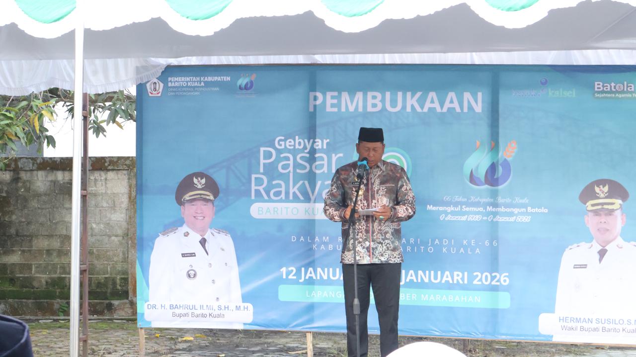 Kabarsiar, Barito Kuala – Pemerintah Kabupaten Barito Kuala resmi membuka Gebyar Pasar Rakyat dalam rangka menyemarakkan Hari Jadi ke-66 Kabupaten Barito Kuala. Pembukaan dilakukan langsung oleh Bupati Barito Kuala Bahrul Ilmi di kawasan samping Taman Pematang Bastun, Marabahan, Senin (12/01/2026).